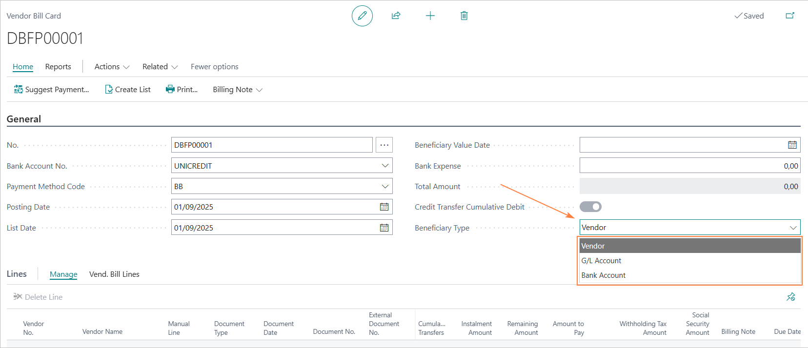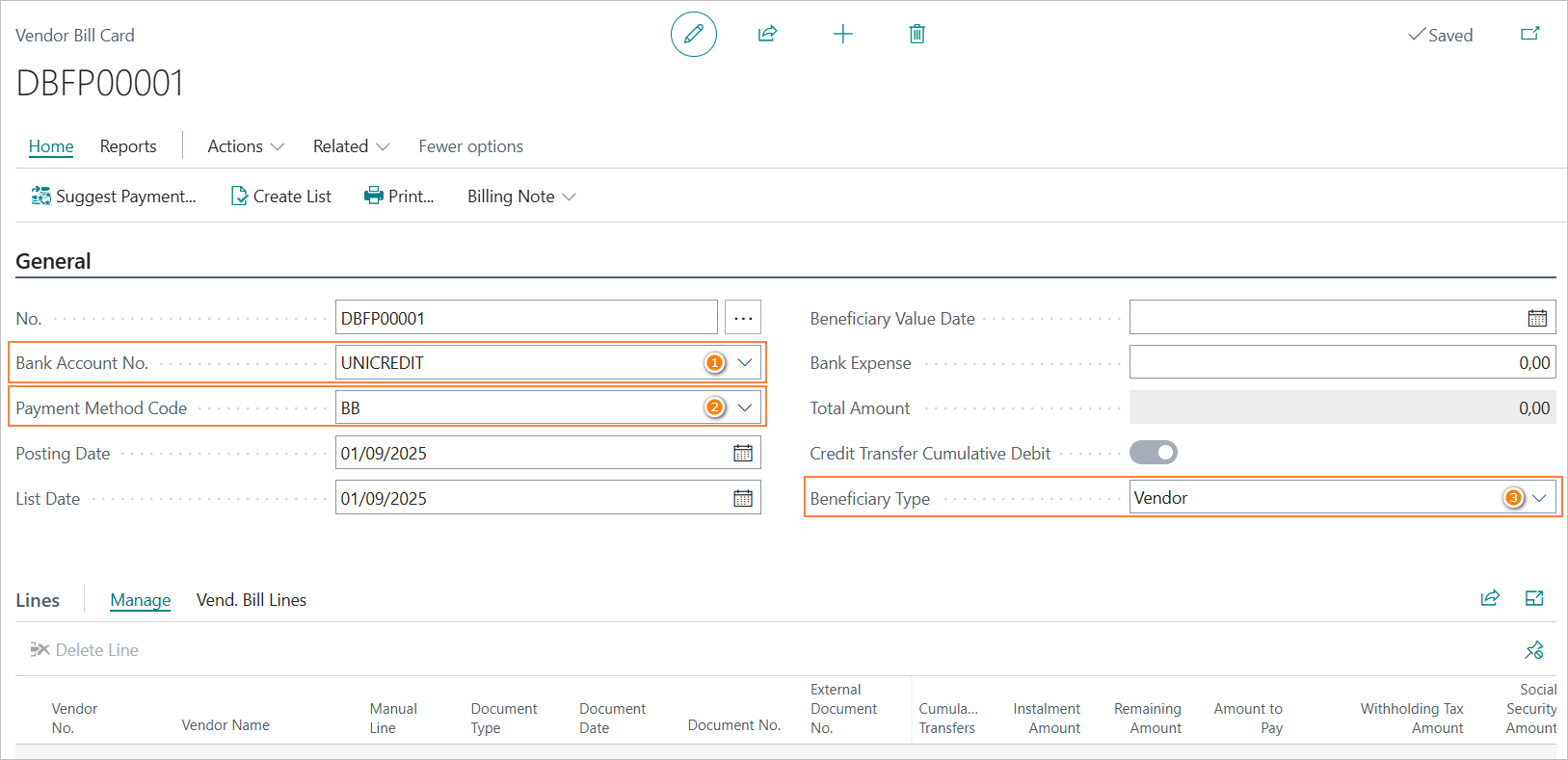 As with SEPA transfers to vendors, it is possible to define how the bank should report the payments of the bill list on the periodic statement.