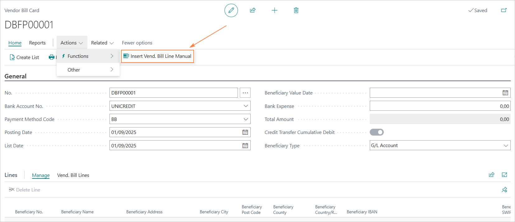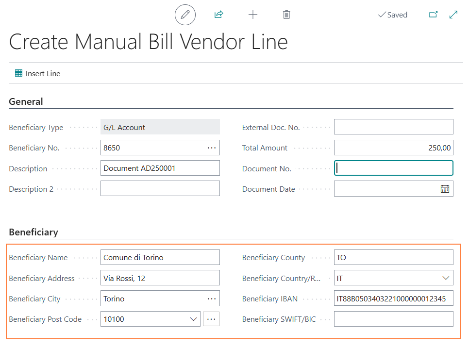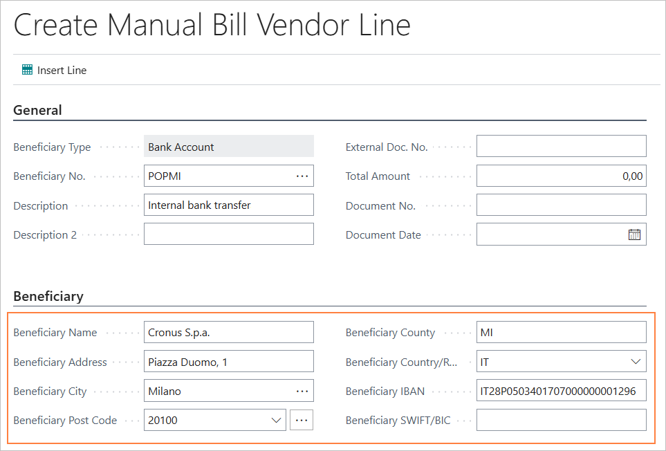 When you select “Insert Cust. Transfer Bill Line Manual”, a page will open where you can manually enter the payment instruction details.