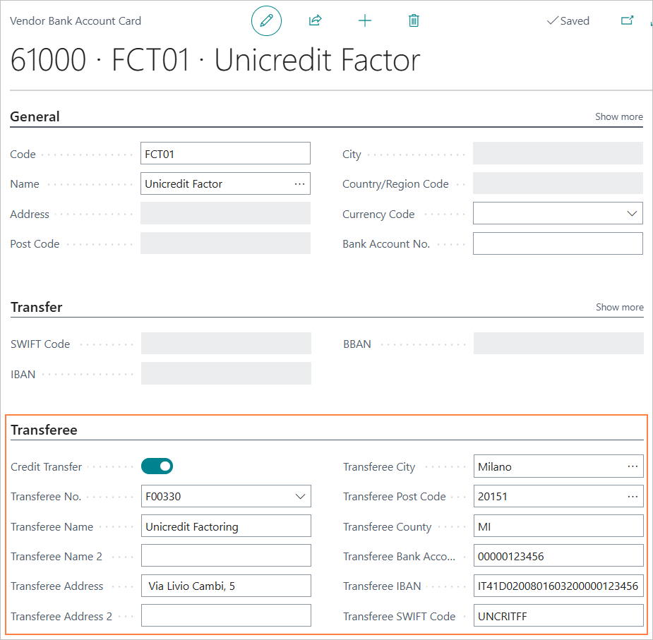 A value must be entered in the “Transfer” tab of the Bank Account card in the “CUC” field. The CUC code (“Codice Univoco CBI”) is mandatory. It is an 8-character alphanumeric code that is assigned by the banking system.