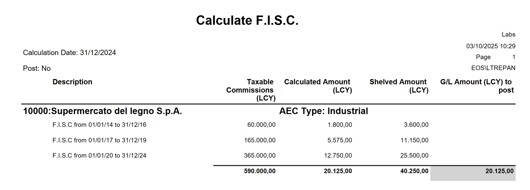 For each salesperson a header reports the Name and the Type AEC. There are as many lines as there are brackets of the FISC calculation years and each shows the taxable commission, the calculated amount, the shelved amount and the amount to be posted: