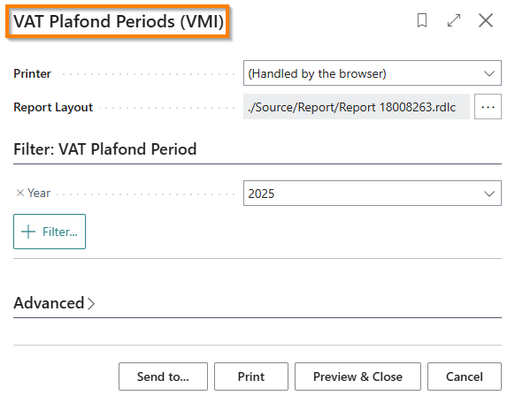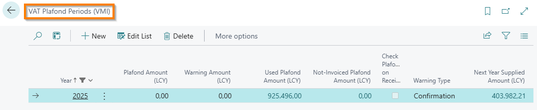 To manage the Fixed VAT Plafond for the year, you need to access the “VAT Plafond Periods (VMI)” page and fill in the following fields: