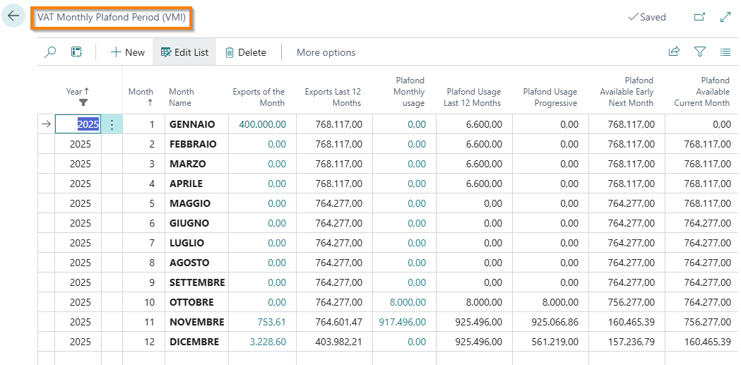 Each time you access the “VAT Monthly VAT Plafond Period (VMI)” page, the values in the various columns are automatically updated, except for VAT ceiling values imported via Excel files (specific feature).
