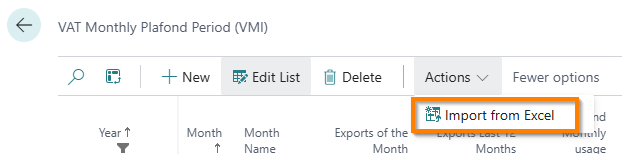 The Excel file must have the same structure as the “VAt Monthly Plafond Period (VMI)” page; we recommend generating the Excel template using the standard BC “Open in Excel” functionality.