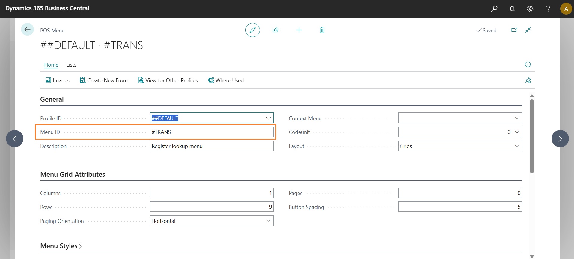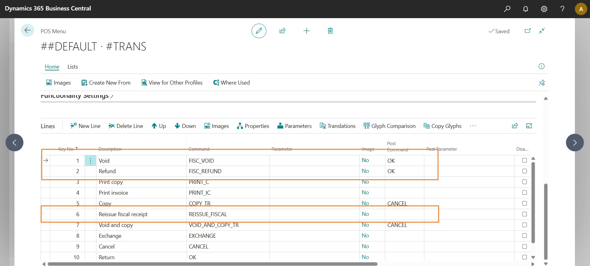 To enable the correct issuance of sales return receipts, void receipts, and the fiscal reprint of previously issued documents, it is necessary to modify the POS menu linked to the transaction register panel. The setup must be performed for each menu profile in use.