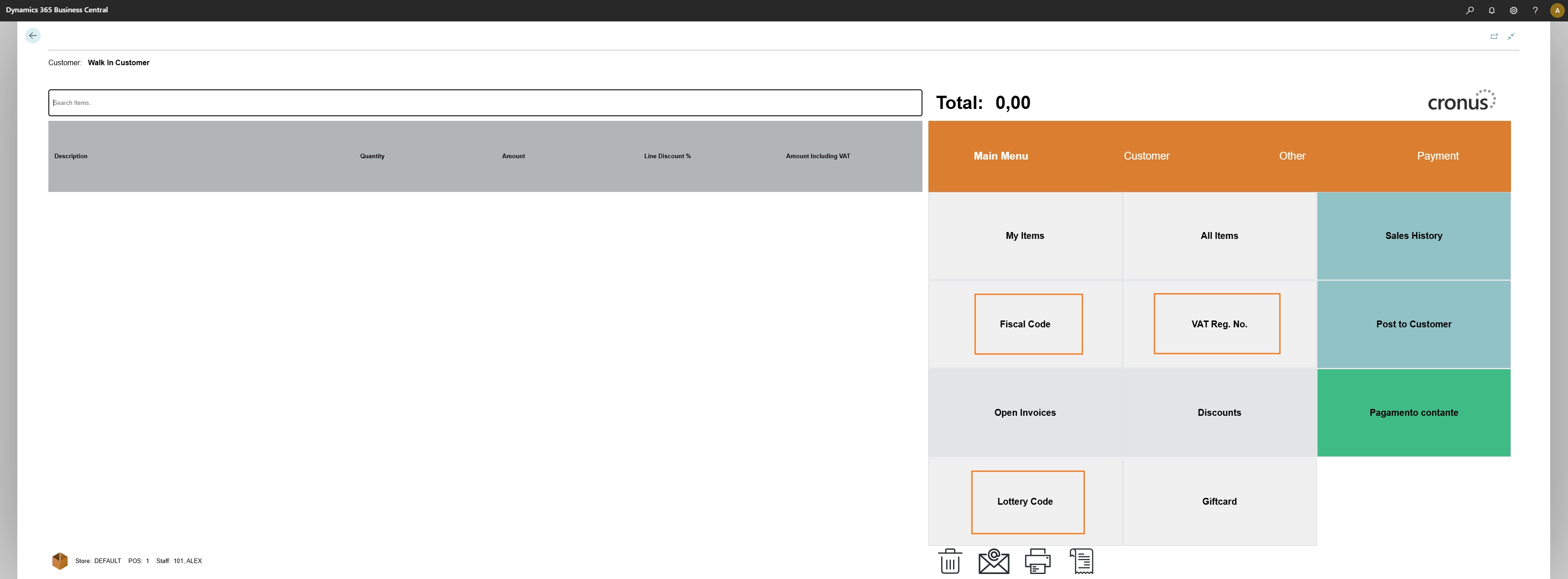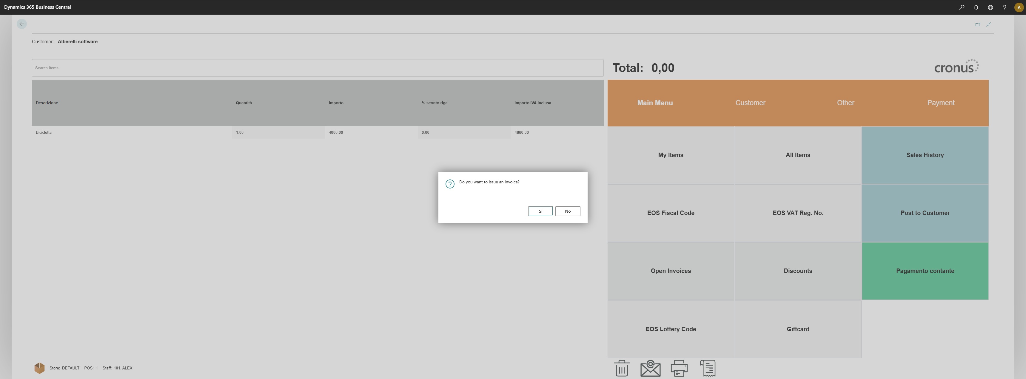 If a customer other than the “Walk‑in” customer defined in the setup is selected at the POS, and if invoice management is enabled, the system will allow the creation of sales invoices and sales credit memos without issuing the related commercial document through the fiscal printer. If the “Active Invoice Management” flag is enabled in the Sales Profile setup in use, and the “Invoice Management Type” field is set to “Request Invoice”, then at the end of a POS sale the system will prompt the user to confirm whether they want to issue a sales invoice or a sales credit memo. If the user selects “No”, the system will issue a sales commercial document instead.