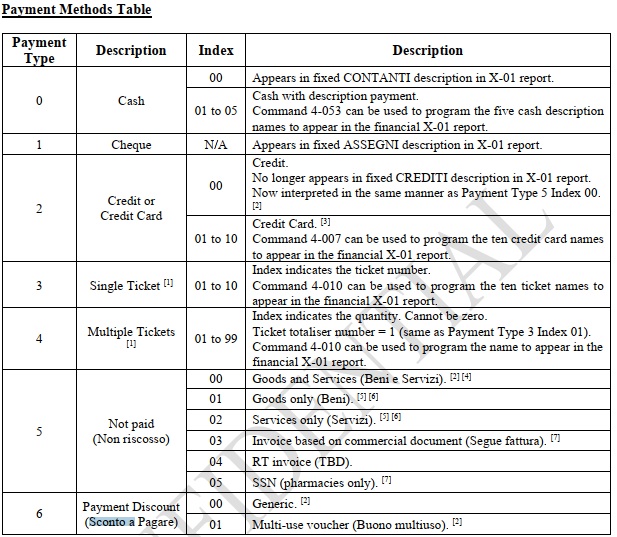 For the purpose of issuing a sales document, return, or cancellation through an Epson fiscal printer, it is necessary to define, for each payment method available in the stores, the corresponding payment category as required by the Italian Revenue Agency. The various definable categories and their specifications are provided by the Italian Revenue Agency. Below is a table listing the accepted categories: