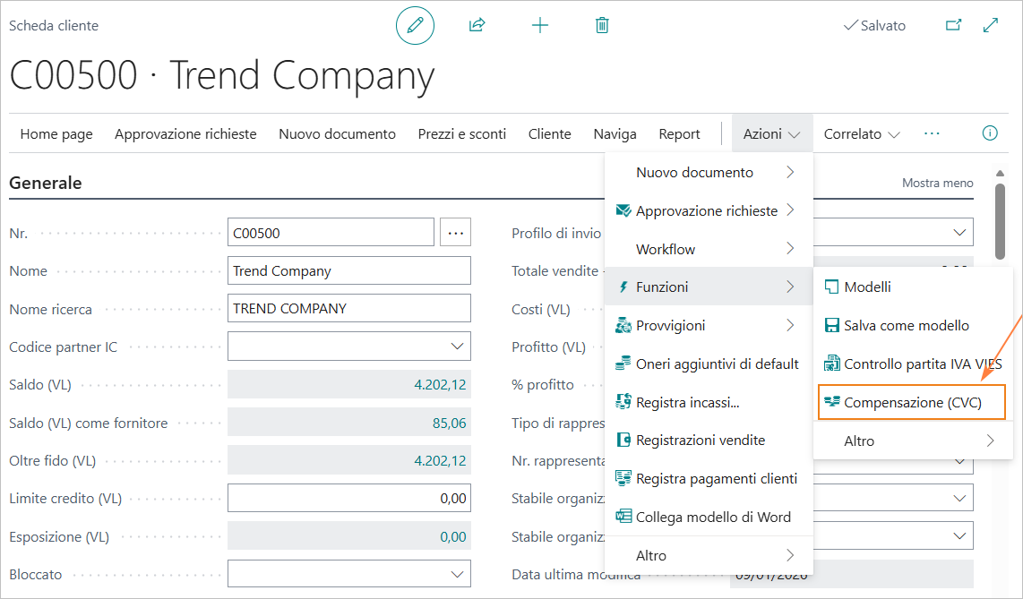 Dalla Scheda Cliente/Fornitore si accede alla pagina di compensazione dall’azione “Compensazione (CVC)".