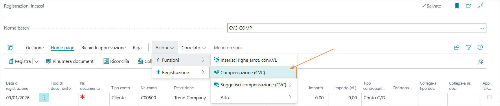 L’azione “Apri batch reg.” consente di accedere al batch utilizzato per le scritture di compensazione.
