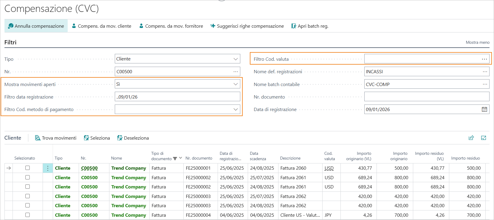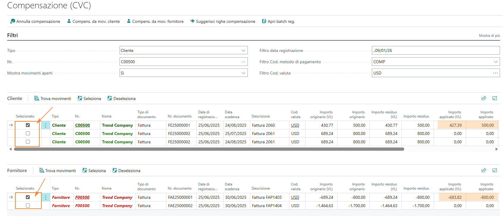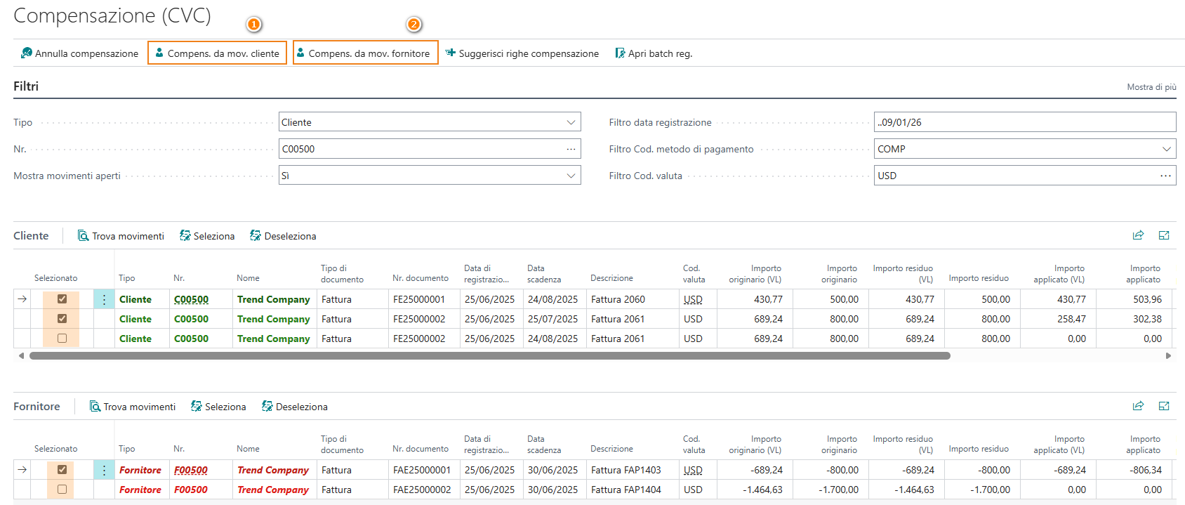 La pagina di compensazione mostrerà le partite clienti e fornitori in base ai filtri impostati.