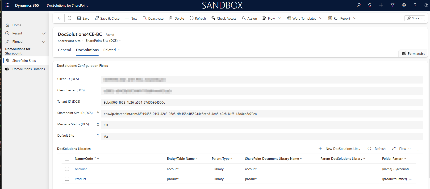- Dalla pagina DocSolution SharePoint Setup, impostare Tenant ID, Client ID e Client Secret (gli stessi usati in CE).