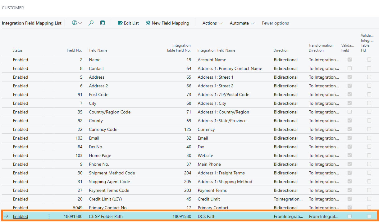 - Aprire Setup integrazione standard BC↔Dataverse e assicurarsi che il mapping includa il campo percorso cartella proveniente da CE (indicato come CE SP Folder Path o equivalente).
