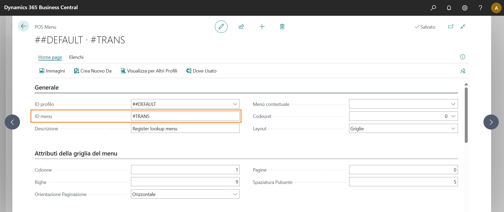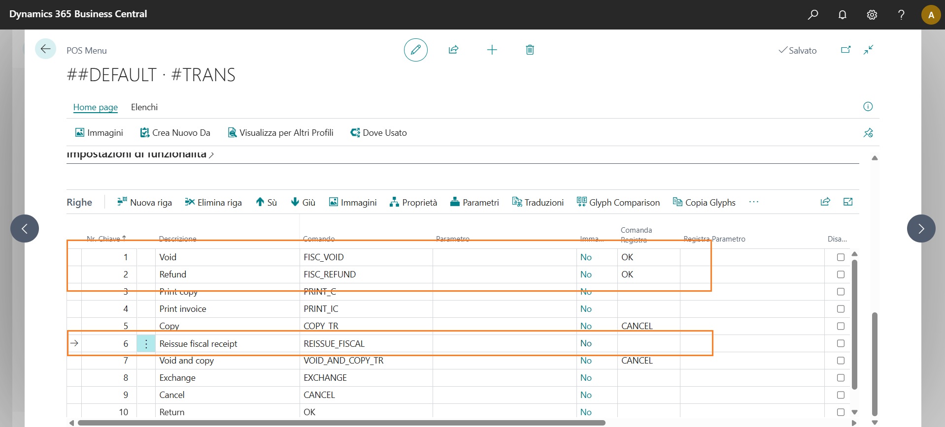 Per consentire la corretta emissione di documenti commerciali di reso vendita, documenti commerciali per annullo ed permettere la stampa fiscale della copia di un documento precedentemente emesso, è necessario modificare il menù di cassa legato al pannello del registro delle transazioni. Il setup va eseguito per ogni profilo menù utilizzato.
