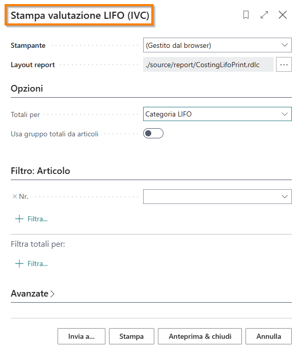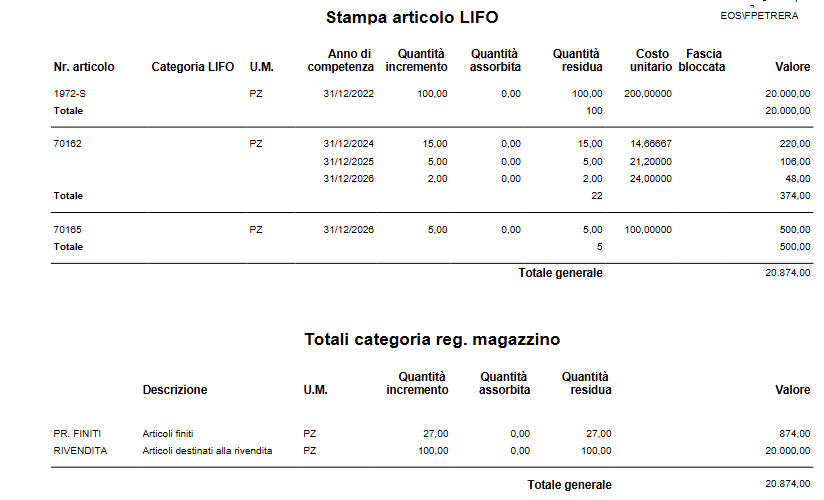 Al termine del processo di calcolo è necessario lanciare la “Stampa Valutazione LIFO (IVC)”: se non viene applicato un filtro sull’articolo o su una qualsiasi informazione legata all’Articolo, vengono stampati tutti gli articoli con fasce LIFO.