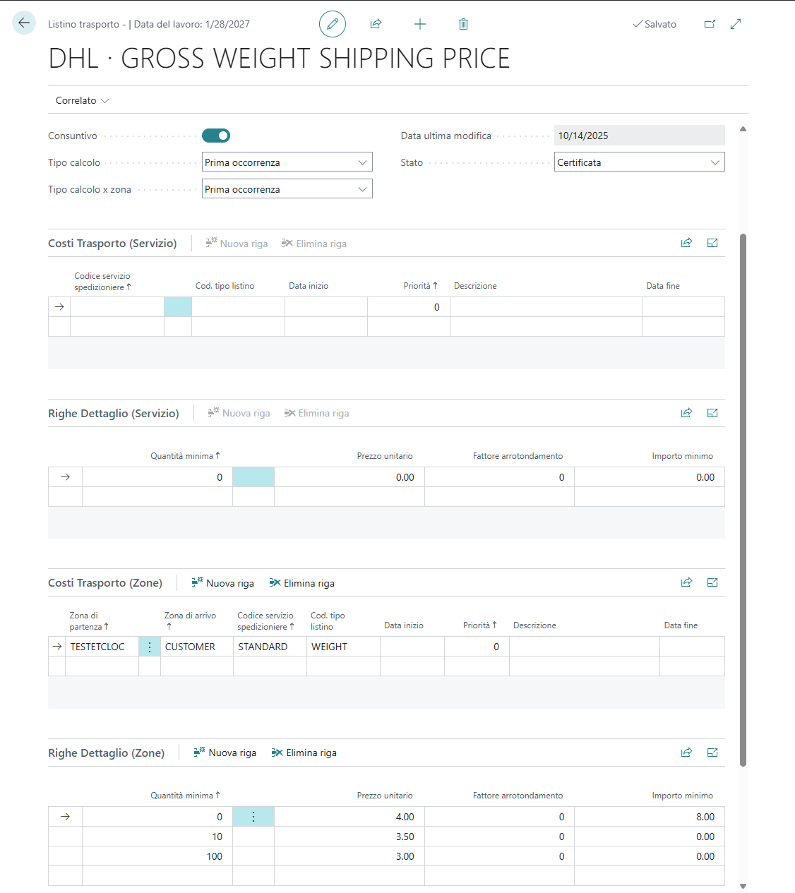 La funzione nuovo setup wizard, da utilizzare in ambiente DEMO o TEST, permette di creare dei dati dimostrativi per cominciare a utilizzare i costi di trasporto. In particolare vengono creati i listini di trasporto DHL e FEDEX, che possono essere usati per suggerire i costi di trasporto.