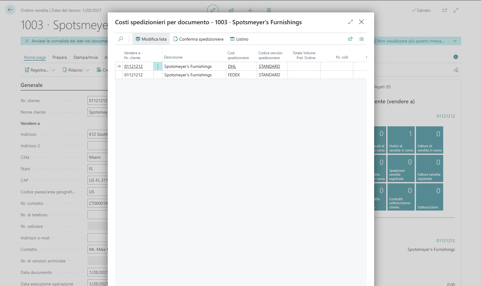 Quando si esegue il setup wizard, su richiesta, è possibile anche creare un ordine di vendita di prova in cui eseguire il suggerimento dei costi di trasporto.